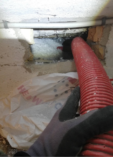Mange tror, at man skal kunne kravle ned i krybekælderen for at isolere, men det behøver man ikke. Vi borer små huller i soklen eller gulvet og blæser de små flamingokugler ind under tryk, så de fordeler sig jævnt i hele rummet.